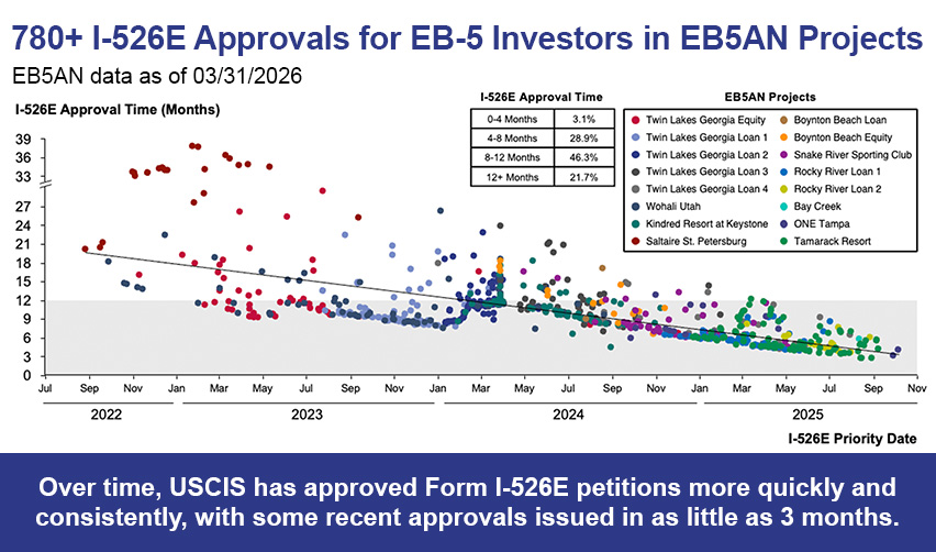 Since the EB-5 Reform and Integrity Act of 2022 (RIA), more than 780 investors in EB5AN’s projects have received I-526E approval. Recently, nearly all of those I-526E approvals have been received in less than one year, with some processed in as few as three months. The priority processing of rural I-526E petitions has played a major role in this outcome. Additionally, these projects have already created over 15,000 EB-5–eligible jobs. Because job creation is a central element of the Form I-829 petition, these investors are well positioned for smooth I-829 approval when it comes time to file.