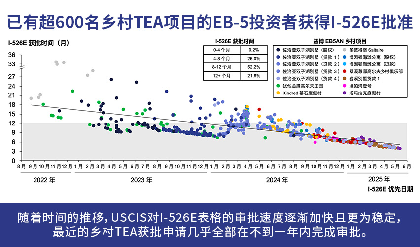 最显著的成果之一是与乡村TEA投资相关的I-526E申请审理时间得到了缩短。 益博EB5AN发售的项目中最新获批的乡村TEA项目投资人几乎全部在不到一年内获批,相较于以往通常超过一年的平均受理时间,耗时得到了显著提升。一些申请甚至仅耗时约4个月就获得了审批。