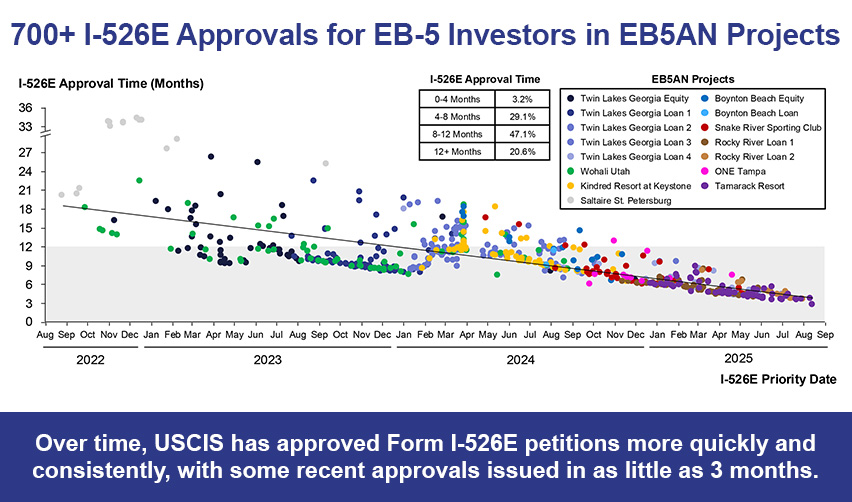 Since the EB-5 Reform and Integrity Act of 2022 (RIA), more than 700 investors in EB5AN’s projects have received I-526E approval. Recently, nearly all of those I-526E approvals have been received in less than one year, with some processed in as few as three months. The priority processing of rural I-526E petitions has played a major role in this outcome. Additionally, these projects have already created over 14,000 EB-5–eligible jobs. Because job creation is a central element of the Form I-829 petition, these investors are well positioned for smooth I-829 approval when it comes time to file.