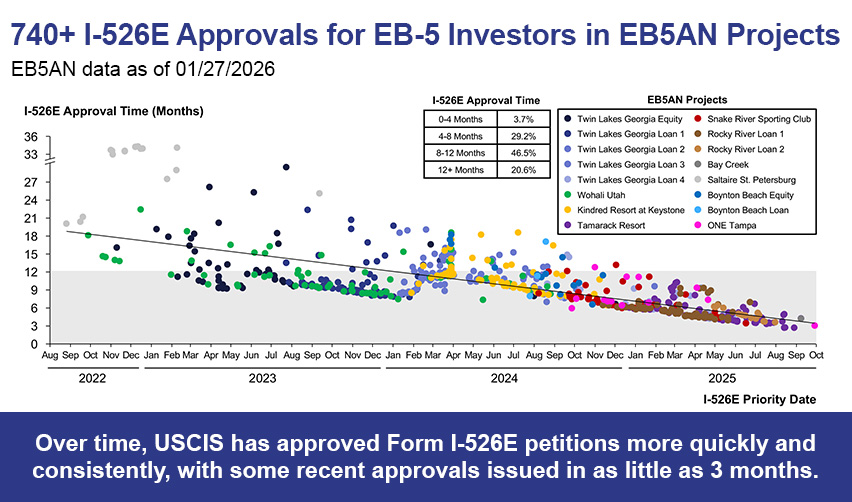Since the EB-5 Reform and Integrity Act of 2022 (RIA), more than 740 investors in EB5AN’s projects have received I-526E approval. Recently, nearly all of those I-526E approvals have been received in less than one year, with some processed in as few as three months. The priority processing of rural I-526E petitions has played a major role in this outcome. Additionally, these projects have already created over 15,000 EB-5–eligible jobs. Because job creation is a central element of the Form I-829 petition, these investors are well positioned for smooth I-829 approval when it comes time to file.