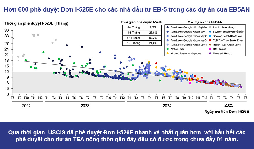 Kể từ khi Đạo luật Cải cách EB-5 năm 2022 (RIA) ra đời, hơn 600 nhà đầu tư vào các dự án của EB5AN đã nhận được phê duyệt I-526E. Gần đây, hầu hết các phê duyệt Đơn I-526E đều có được trong vòng chưa đầy một năm, một số hồ sơ còn được xử lý chỉ trong vòng 04 tháng. Việc ưu tiên xử lý đơn I-526E cho các dự án nông thôn đóng vai trò quan trọng để có được kết quả này.
