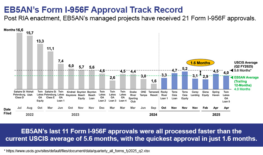 While the average USCIS processing time for Form I-956F is approximately 5.6 months, EB5AN approvals have been significantly faster. Several projects were approved in under three months, with the fastest approval in 1.6 months. Our last 11 approvals were all issued in less time than the USCIS average.