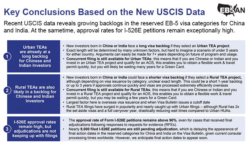 - Given the pace of I-526E filings and adjudications in both the rural and urban set-asides, we expect both categories to enter a backlog. Chinese and Indian nationals will face significant delays before receiving their Green Cards.